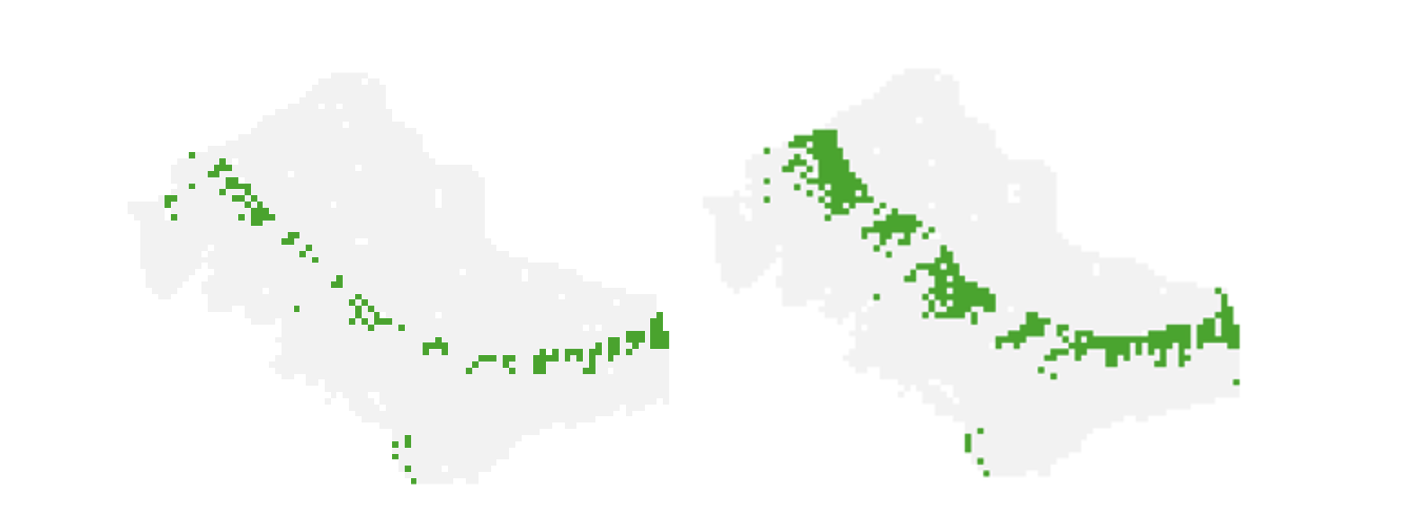 Making use of remotely sensed imagery of forest cover in 2013 and 2019, as well as rainfall conditions for both years, we identify likely areas suitable for such dry forests (left 2013, right 2019):